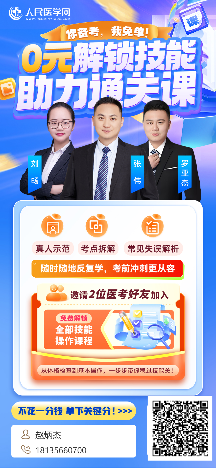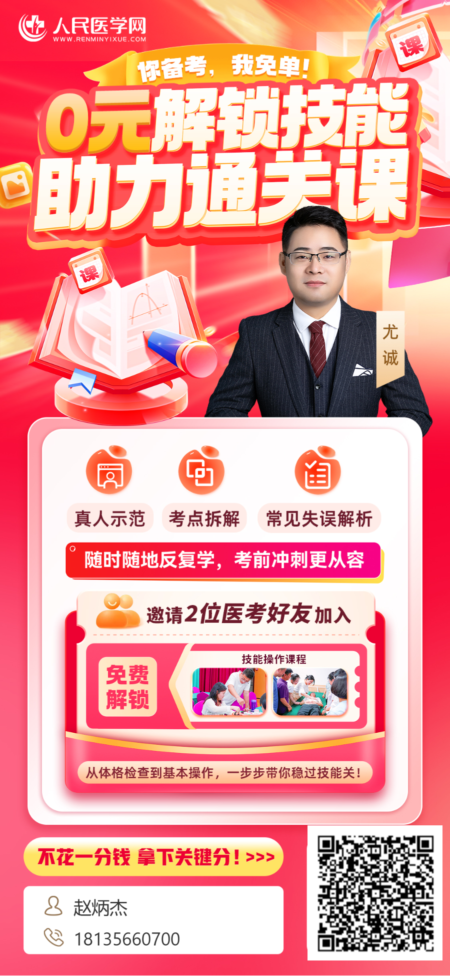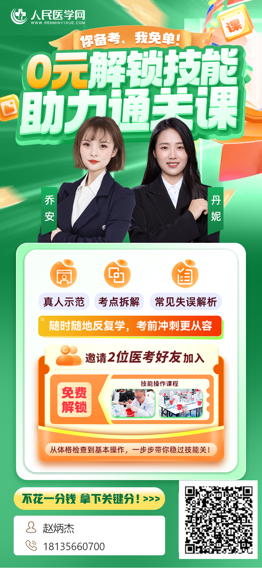 实践技能考试时间已定,技能考试作为医师资格考试的第一关拦路虎,一定要早做准备,扫描上方二维码,0元解锁技能助力通关课,从体格检查到基本操作,一步步带你稳过技能关!